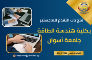 يعلن قطاع الدراسات العليا بكلية هندسة الطاقة جامعة أسوان عن فتح باب التقدم للماجستير للعام الجامعي 2025/2026م من يوم الأربعاء 1/10/2025 حتى يوم الخميس الموافق 30/10/2025م في التخصصات التالية: