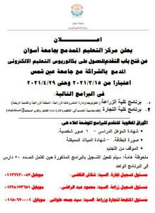 يعلن مركز التعليم المدمج بجامعة أسوان عن فتح باب التقدم للحصول على بكالوريوس التعليم الإلكتروني المدمج بالشراكة مع جامعة عين شمس اعتبارًا من 15/3/2021 إلى 29/4/2021, في البرامج الآتية :