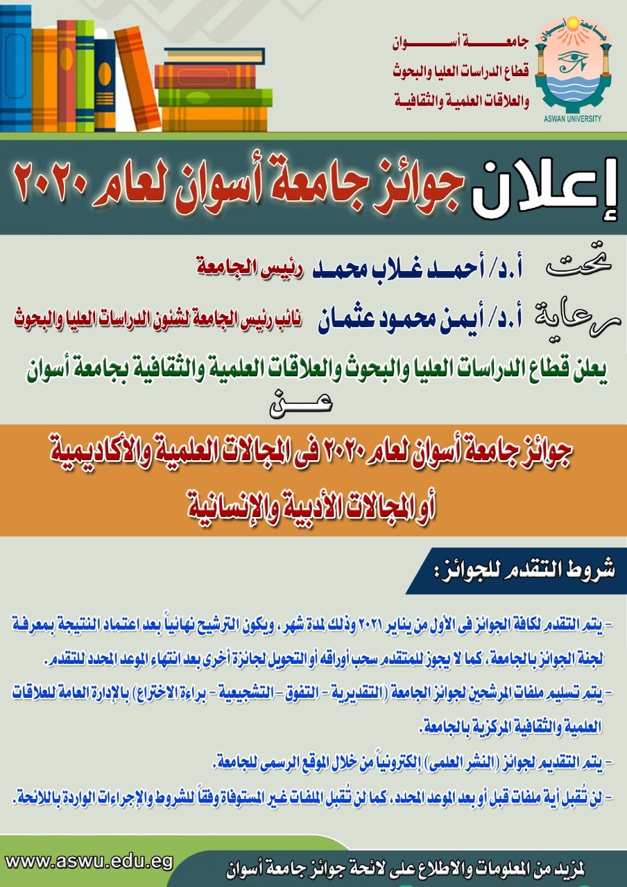 تحت رعاية الأستاذ الدكتورأحمد غلاب رئيس جامعة أسوان والأستاذ الدكتور أيمن محمود عثمان نائب رئيس الجامعة للدراسات العليا والبحوث يعلن قطاع الدراسات العليا والبحوث والعلاقات العلمية والثقافية بجامعة أسوان عن جوائز جامعة أسوان 2020