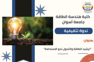 تحت رعاية الأستاذ الدكتور / لؤي سعد الدين نصرت_ رئيس جامعة أسوان، والأستاذ الدكتور/ أشرف إمام_ نائب رئيس الجامعة لشئون خدمة المجتمع وتنمية البيئة، والأستاذ الدكتور/ طارق حسن محمد_ عميد كلية هندسة الطاقة جامعة أسوان، والأستاذ الدكتور / أحمد ثابت_ وكيل الكلية لشئون خدمة المجتمع وتنمية البيئة، تنظم كلية هندسة الطاقة ندوة تثقيفية بعنوان: