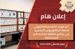 تعلن كلية هندسة الطاقة جامعة أسوان عن أن آخر موعد للتقديم الإلكتروني لحملة البكالوريوس للتسجيل في برنامج الطاقة المتجددة و المستدامة الخميس القادم 18 سبتمبر 2025 على الرابط التالي: https://transfer.aswu.edu.eg/reg3.aspx