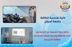 نظمت كلية هندسة الطاقة جامعة أسوان يوم الثلاثاء 18 نوفمبر 2025، ندوة تثقيفية تناولت عدة جوانب خاصة بالترابط بين المياه والطاقة وصولًا لاستخدام تكنولوجيا الطاقة النظيفة في تحلية المياه، وذلك تحت رعاية الأستاذ الدكتور/ لؤي سعد الدين نصرت_ رئيس جامعة أسوان، والأستاذ الدكتور/ أشرف أمام_ نائب رئيس الجامعة لشئون خدمة المجتمع وتنمية البيئة، والأستاذ الدكتور/ طارق حسن محمد_ عميد كلية هندسة الطاقة، والأستاذ الدكتور/ أحمد ثابت_ وكيل الكلية لشئون خدمة المجتمع وتنمية البيئة، وبحضور كوكبة من أعضاء هيئة التدريس والقيادات الإدارية والهيئة المعاونة والطلاب، وذلك تأكيدًا على حرص الكلية على قيامها بدورها المجتمعي وخدمة البيئة المحيطة وتعزيزًا لنشر العلوم والمعرفة.