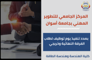 يعلن المركز الجامعي للتطوير المهني بجامعة أسوان إنه بصدد تنفيذ يوم توظيف لطلاب الفرقة النهائية وخريجي كلية الهندسة وكلية هندسة الطاقة بالتعاون مع شركة InnOVO Build egypt، والمقرر عقده يوم الثلاثاء الموافق 10 فبراير 2026م بمقر المركز بأسوان الجديدة، وذلك بحضور السادة العمداء وأعضاء هيئة التدريس والطلاب والخريجين بالكليتين.
